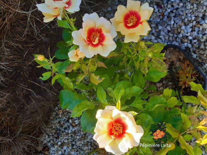 Couleurs : Jaune crème au cœur grenat Hauteur : 0,70 x 0,50 m Floraison : Remontant Parfum : Sans