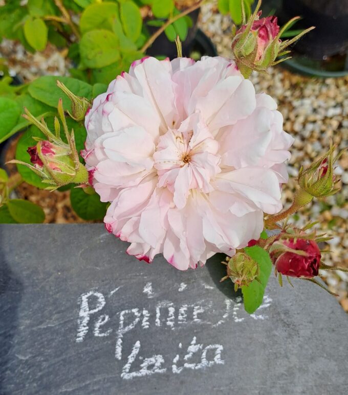 Couleurs : Blanc liseré carmin Hauteur : 1 x 0,80 m Floraison : Non remontant Parfum : +