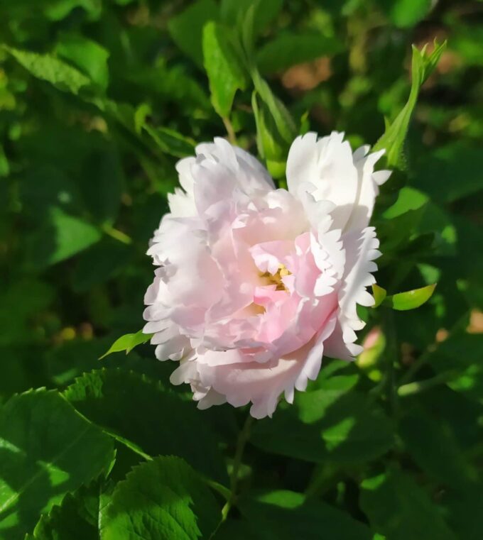 Couleurs : Blanc à rose clair Hauteur : 1,50 x 1,20 m Floraison : Légèrement remontant Parfum : + Pied mère présent dans la roseraie, indisponible à la vente